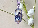 An acrylic charm of Yuuko and Watanuki from xxxHolic, parted by a screen of faint purple smoke.